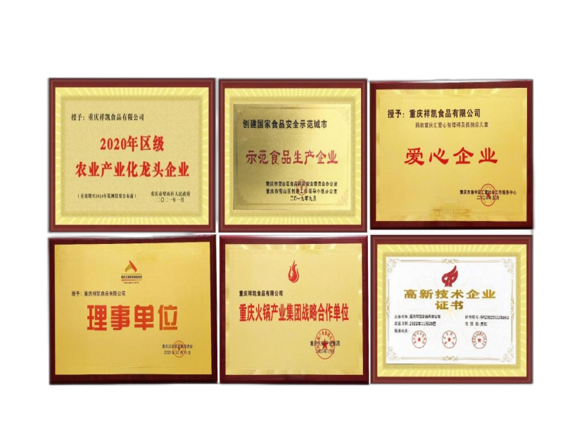 公司先后通過ISO三體系認證,知識產權認證,兩化融合A級認證,有系統的多層次員工培訓體系。2019年成為“示范食品生產企業”,2020-2023年被授予“區級農業產業化龍頭企業”,2022年獲得高新技術企業(證書編號GR202251101662),是重慶江湖菜發展促進會理事單位,重慶火鍋產業集團副會長單位,也是重慶輕工職業學院共建單位,重慶食品工業研究所合作單位。